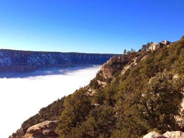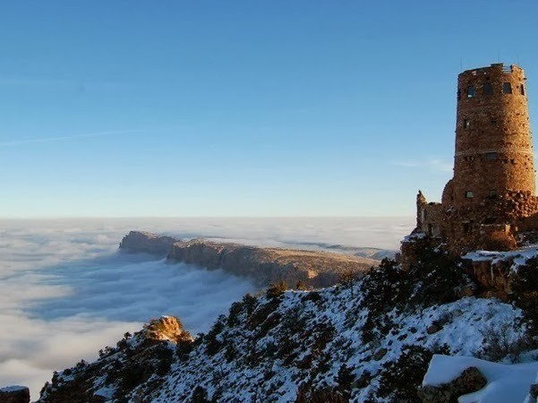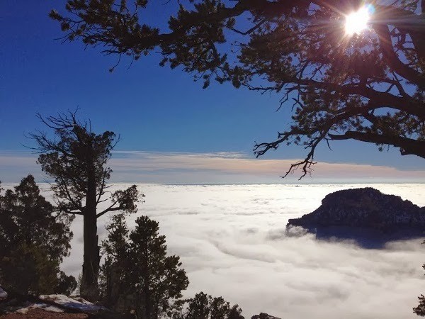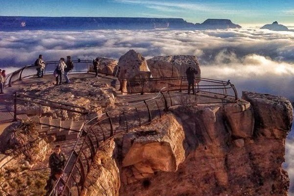 Saat Grand Canyon ditutupi kabut tebal, pemandangannya benar-benar cantik. Hanya ada beberapa puncak tebing yang terlihat menembus kabutnya. Anda pun bisa trekking ke atas puncak tebingnya untuk memandangi pemandangan cantik tersebut.