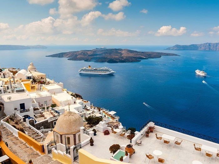 Santorini adalah salah satu pulau cantik yang menjadi destinasi tujuan bulan madu sebagian traveler. Bangunan bercat putih putih biru, pantai yang indah dan pandangan depan mata lautan luas merupakan daya tarik utama bagi traveler.