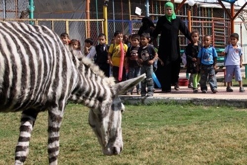 "Rambutnya kami potong dan kami warnai belang-belang hitam putih. Anak-anak menyukainya," kata Berghat. Untuk situasi darurat seperti di Palestina, sepertinya dunia memaklumi kalau ada kebun binatang dengan hewan palsu.