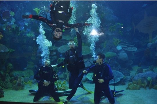 Di waktu tertentu, pegawai akuarium akan menyelam ke dalam seatube untuk memberi makan. Anda pun bisa melihatnya langsung.