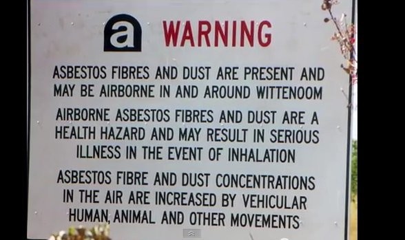 Sebuah papan peringatan untuk orang yang berkunjung berdiri tegak di Kota Wittenoom. Dalam papan tersebut tertulis bahwa serat dan debu asbes bisa saja masih ada di Wittenoom.