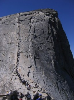 Salah satu landmark terkenal di California adalah Yosemite Valley. Half Dome, salah satu batu yang paling terkenal dan banyak dinaiki wisatawan. Namun, butuh usaha keras untuk bisa mencapai puncaknya. Memang hanya naik tangga, namun tidak seperti tangga lainnya.