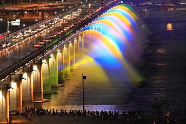 Selain dikenal dengan boyband dan girlband, Seoul juga punya jembatan dengan air mancur terpanjang di dunia. Banpo Moonlight Rainbow Fountain merupakan air mancur di sepanjang Jembatan Banpo, Seoul, Korea Selatan.