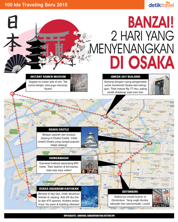 Osaka seringkali menjadi titik start untuk traveler yang ingin menjelajah Jepang ke arah Utara seperti Tokyo dan Hokaido. 2 Hari dianggap cukup untuk menikmati kota ini. Dihimpun detikTravel, beginilah caranya: