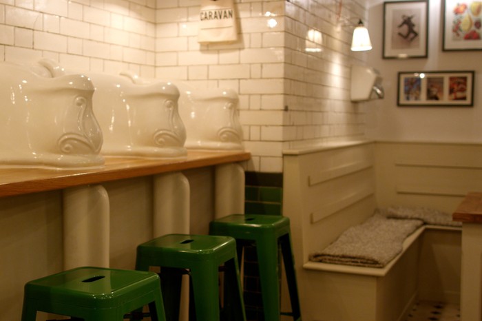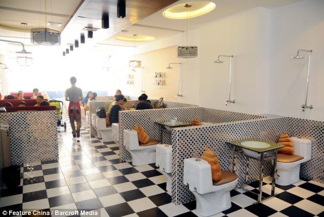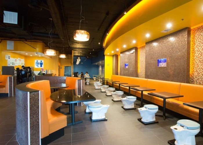 Interior restoran ini sengaja dibuat mirip toilet, termasuk tempat duduknya. Anda bisa memesan aneka menu seperti 'smells like poop' yang adalah nasi dan daging, atau 'bloody number two' yang merupakan gabungan es krim vanilla dan stroberi.