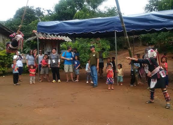 Saat bersamaan, warga lainnya mulai bersiap untuk berayun di tiang bambu setinggi 15-an meter. Berayun menjadi bagian dari tradisi Suku Akha. Bambu besar dari hutan di hutan desa ditebang dijadikan tiang.