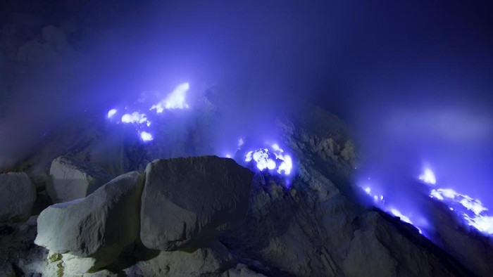 Api biru terlihat di tanah dan bebatuan Kawah Ijen. Menyala dengan sangat terang, menghipnosis siapa saja yang melihatnya. Kamu tahu api yang berwarna biru di kompor gas, maka api seperti itulah yang kamu lihat di sana.