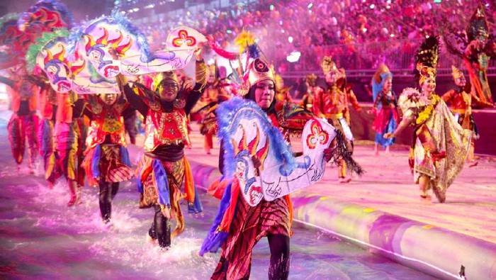Pesta tahun ini terasa berbeda dengan penyelenggaraan tahun-tahun. Lintasan di muka tribun kali in dibagi menjadi tiga area dengan tema berbeda. Sebuah panggung panjang dibangun di kiri lintasan, sedangkan pada sisi kanan sebuah kolam air menjadi lintasan penari.