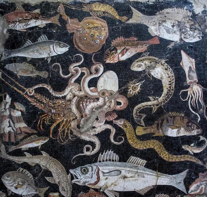 Lantai bangunan dipasang dengan mosaik kehidupan laut. Ada dogfish, ikan, lobster dan gurita yang menjadi pengisi lantai.