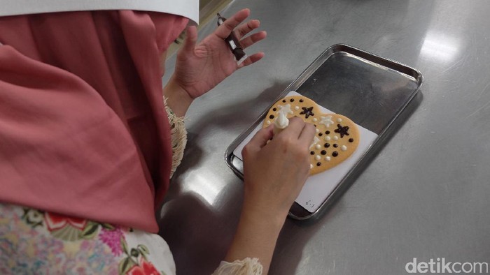 Ada yang melukis motif bintang, hewan, pemandangan dan huruf. Di meja lain, sejumlah bocah yang ditemani orang tuanya begitu riuh. Mereka antusias bercampur senang mempraktikkan menghias kue.