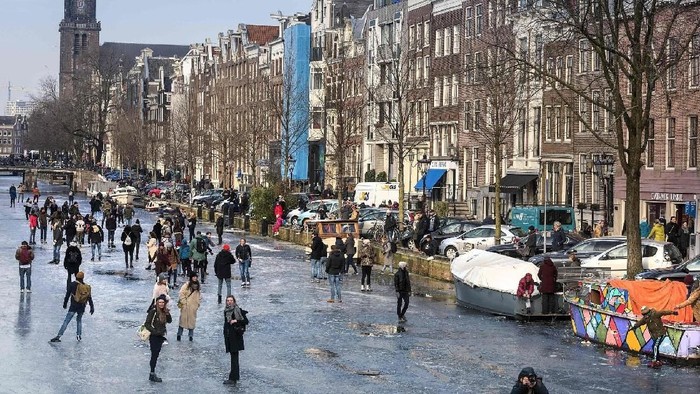 Dilansir detikTravel dari Reuters, Selasa (6/3/2018), gara-gara musim dingin yang parah, warga yang tinggal di Amsterdam, Belanda sampai bisa main ice skating di atas kanal karena sungai-sungai di sana membeku.