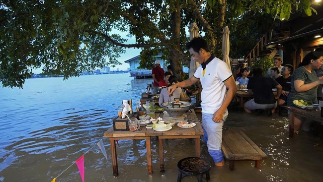 Diberitakan AP News, Rabu (13/11/2021), Restoran Chaopraya Antique Cafe tetap didatangi pengunjung walau air menggenang. Para staf mengenakan sepatu bot karet, mereka melangkah dengan hati di tengah air yang pasang. Pengunjung dengan antusias menyantap makanan, seolah hal yang biasa.
