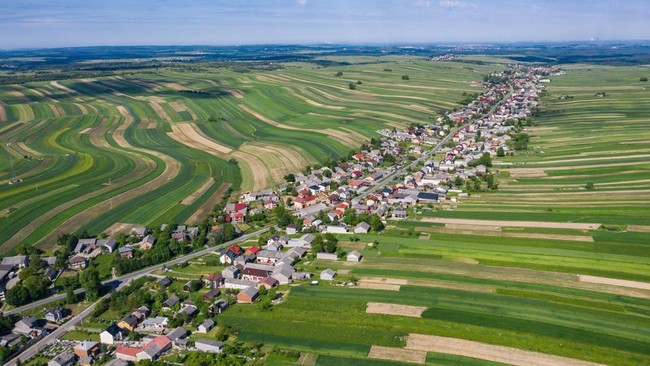 Ada desa viral di Polandia. Dilihat dari angkasa, rumah warga berada dalam satu garis, terlihat seperti semut berjejer. Uniknya lagi rumah-rumah warga tertata di tepi satu jalan raya.