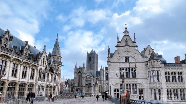 Di sudut jalan, bekas gereja Fransiskan kini menjadi hotel mewah tempat bintang musik Stromae menghabiskan malam pernikahannya di tengah jendela kaca patri khas gereja.