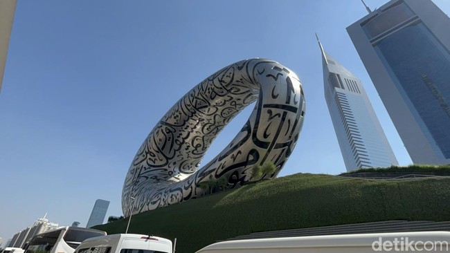 Dubai kini punya Museum of The Future yang jadi salah satu landmark terkenal Dubai. Desainnya yang megah membuatnya masuk ke dalam salah satu museum terindah di dunia. Salah satu yang menonjol adalah kaligrafi yang membungkus seluruh museum dan bisa kita lihat dari tempat yang jauh.