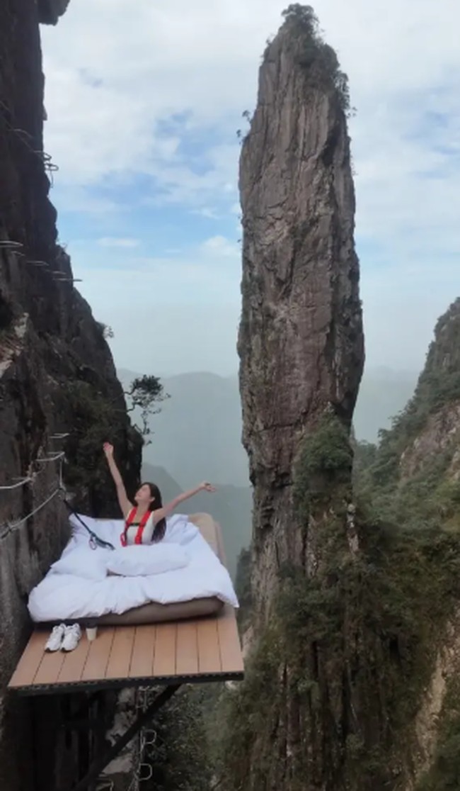 Atraksi ini terletak di Taman Hutan Nasional Mangshan di Chenzhou, namanya Cliff Bed Experience. Atraksi ini menawarkan paket petualangan dengan sebuah tempat tidur, selimut, bantal dan pemandangan yang indah.