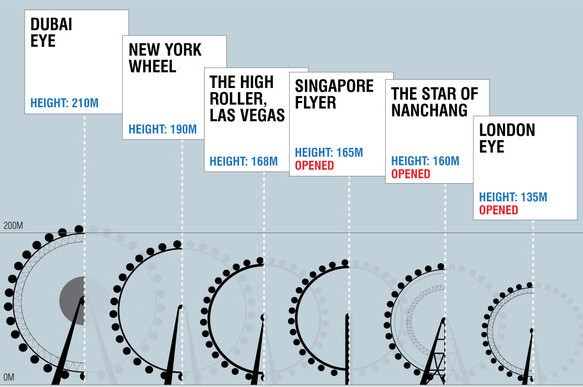 Dari CNN Travel, Senin (18/2/2013), inilah proyek raksasa berikutnya di Kota Dubai. Bianglala tertinggi di dunia dengan ketinggian 210 meter, Dubai Eye, akan mengalahkan para pendahulunya. Saat ini sudah ada 3 bianglala yang bisa dinikmati wisatawan: London Eye di London (135 meter), The Star of Nanchang di sebelah tenggara China (160 meter), dan Singapore Flyer (165 meter).