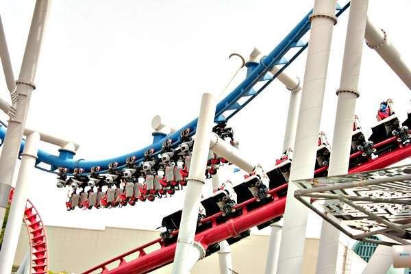Ada dua lintasan kereta berwarna biru dan merah yang membentuk lingkaran, mewakili Human melawan Cylon. Jenis kereta dan tantangannya pun berbeda. Saat menaiki roller coaster ini, seolah-olah Anda bertabrakan satu sama lain. Berani?