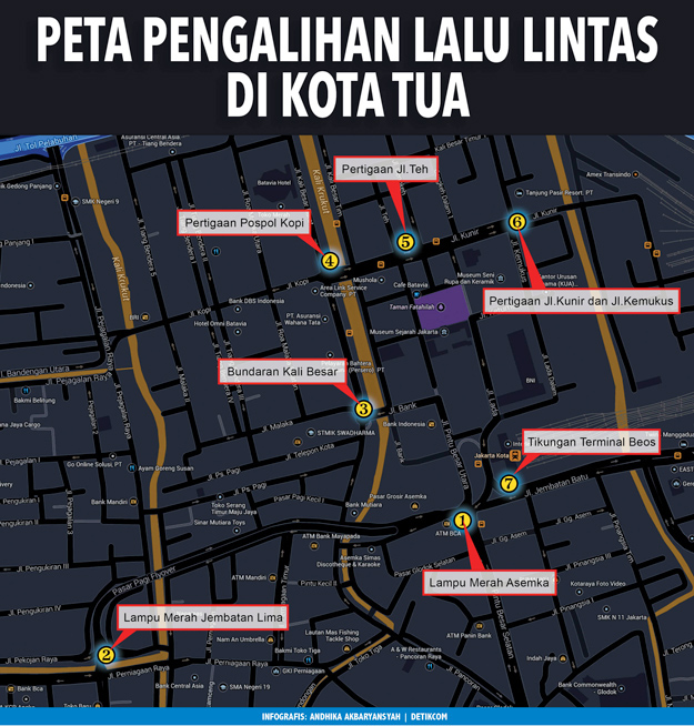 Nantinya akan ada pengalihan jalan di 7 titik. Wisatawan dan masyarakat yang hendak mengarah ke kawasan tersebut, diimbau untuk menempuh jalur alternatif. Berikut 7 titik pengalihan arus lalulintas sekitar Kota Tua: