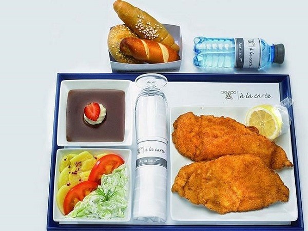 Menu tersebut tersedia bagi penumpang kelas ekonomi yang telah terlebih dulu pre-order sebelumnya. Viennese Schnitzel merupakan daging yang digoreng renyah dan disajikan dengan puding coklat, roti, dan buah-buahan.