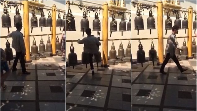 Aksinya terekam CCTV dan bikin masyarakat Thailan geram. Turis berkemeja tersebut sempat berdiri lama dan memainkan sebuah lonceng dengan tangannya. Kemudian, dia mengambil langkah mundur lalu menendang lonceng sebelum akhirnya berjalan tanpa rasa bersalah.