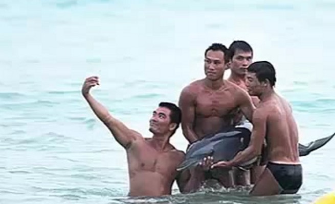 Bukannya memanggil petugas pantai atau mendorongnya kembali ke laut, mereka malah menarik lumba-lumbanya ke tepi pantai. Yang dilakukan selanjutnya bikin traveler dunia dan pemerhati satwa geram, mereka malah mengangkat lumba-lumbanya dan berfoto-foto selfie.