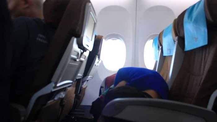 Tidak jarang traveler tidur saat pesawat tengah mengudara. Namun sedikit berbeda dengan turis China, mereka suka tidur sambil memenuhi ruas kursi apabila memungkinkan. Misalnya saja jika mereka duduk sendirian di bangku dengan kapasitas dua atau tiga kursi.