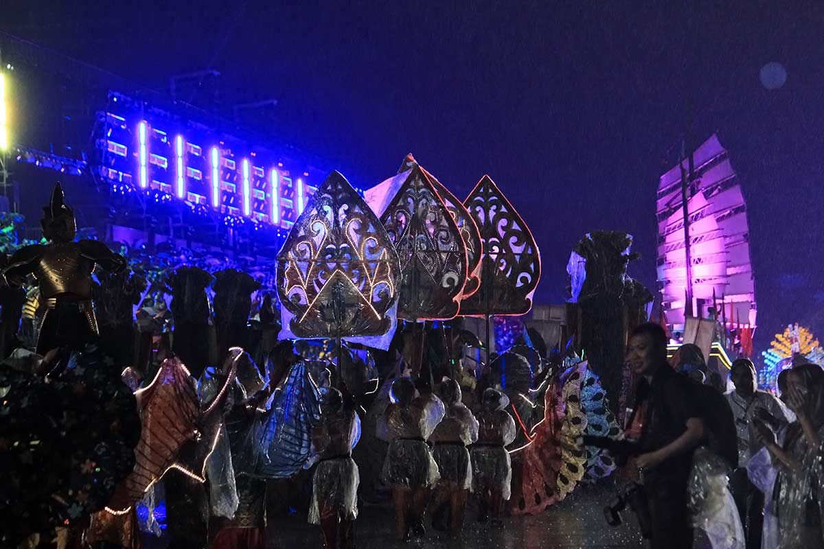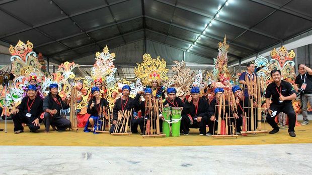 Rombongan Banten Creative and Bamboo Community mulai memainkan angklung buhun, diikuti oleh Gatotkaca berjubah emas yang mengenakan egrang. Kontingen Indonesia pun berjalan dengan penuh kebanggaan dari awal hingga akhir parade.