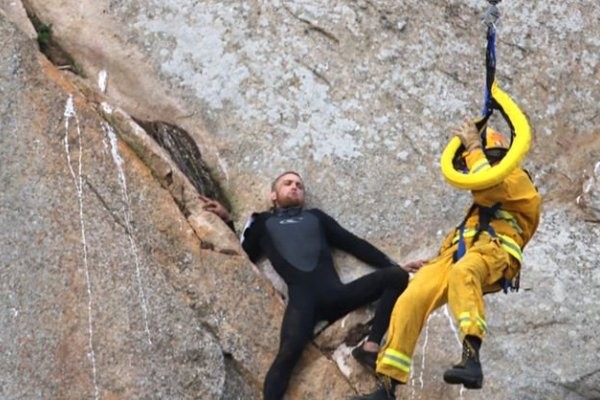 Namun sayang, saat sedang dalam perjalanan menuruni tebing, tangan Michael tersangkut di salah satu celah tebing. Pihak Dinas Pemadam Kebakaran Kota Morro Bay sampai mengerahkan helikopter untuk mengevakuasi Michael.
