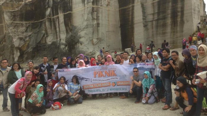 Tebing Breksi berlokasi di Sambirejo, Prambanan, Yogyakarta. Sekitar 1 jam dari Duta Wisma Wacana, tempat bermalam, sekitar 40 d'Traveler berangkat ke Tebing Breksi naik Bus AntaVaya.