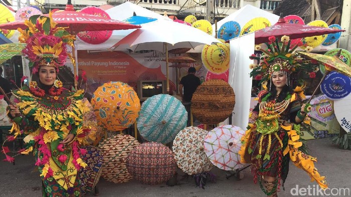 Susunan payung-payung bermotif wastra (kain Nusantara) di bagian depan menjadi daya tarik bagi turis. Mereka penasaran mengintip media promosi 'Wonderful Indonesia' yang dibawa atas dukungan Kementerian Pariwisata.