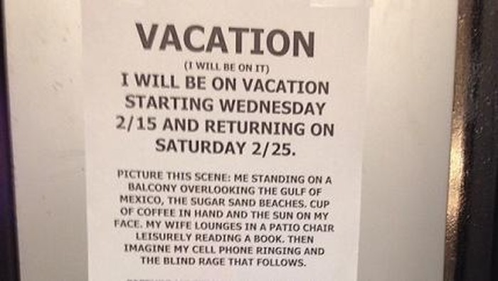 "Saya akan liburan dari Rabu (2/15) dan kembali Sabtu (2/25). Bayangkan adegan ini: Saya berdiri di sebuah balkon menghadap Teluk Meksiko dengan pantai berpasir, secangkir kopi di tangan dengan sinar matahari yang menyinari wajahku dengan istri yang sedang bersantai di bangku sambil membaca buku. Kemudian bayangkan ponsel saya yang berdering, diikuti dengan kemarahan yang luar biasa," tulis pesan di paragaraf pertama.
