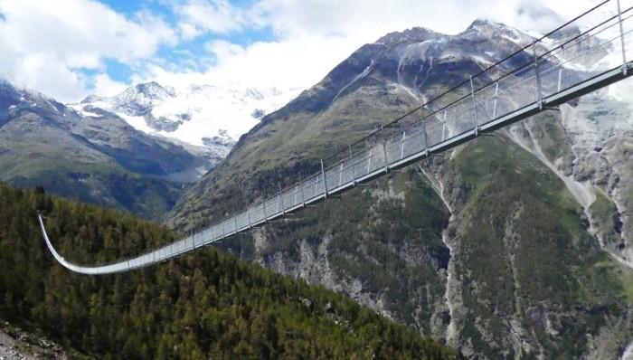 Adalah Jembatan Gantung Charles Kuonen yang baru resmi dibuka pada 29 Juli lalu. Menurut Pariwisata Zermatt, jembatan ini pula yang memecahkan rekor jembatan gantung bagi pejalan kaki terpanjang di dunia.