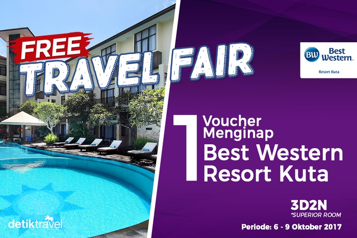 Nah, hari Jumat (6/8/2017) ini Free Travel Fair detikTravel bakal bagi-bagi voucher bermalam gratis di Best Western Resort Kuta 3 hari 2 malam. Ini caranya: