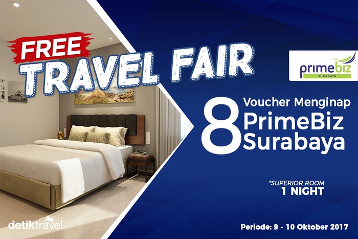 Free Travel Fair dari detikTravel kali ini, Senin (9/10/2017) bagi-bagi voucher bermalam gratis di PrimeBiz Surabaya. Ini caranya:
