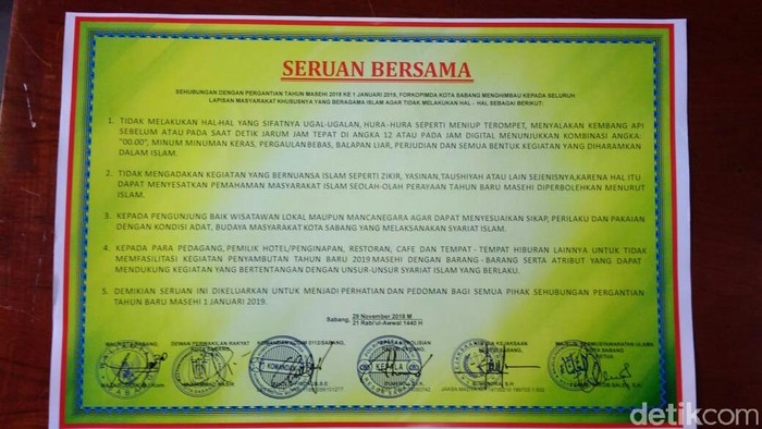 Seruan ini sudah dikeluarkan Pemkot Sabang bersama Forkopimda pada 29 November lalu. Di bawah seruan terdapat tanda tangan Wali Kota, Kejari, hingga Majelis Permusyawaratan Ulama Sabang. Seruan itu sudah disebar ke tempat-tempat umum. (bnl/fay)