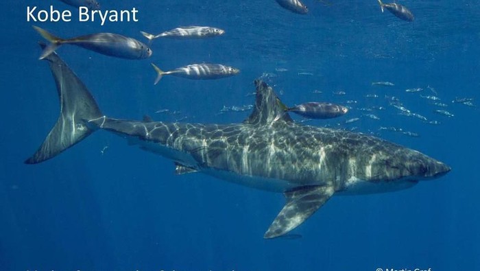 Seekor hiu putih jantan di Laut Pasifik dinamai Kobe Bryant. Hiu putih itu, seperti legenda basket LA Lakers itu, sama-sama identik dengan nomor 24.