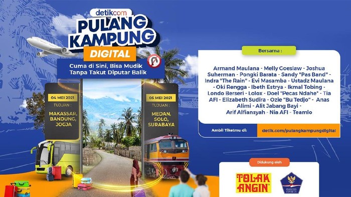 Pulang Kampung Digital ini didukung oleh TOLAK ANGIN dan SATGAS COVID. Buat detikers yang ingin mendapatkan oleh-oleh khas kampung halaman, detikers bisa langsung mengambil tiket sesuai tujuan pulang kampung di sini.