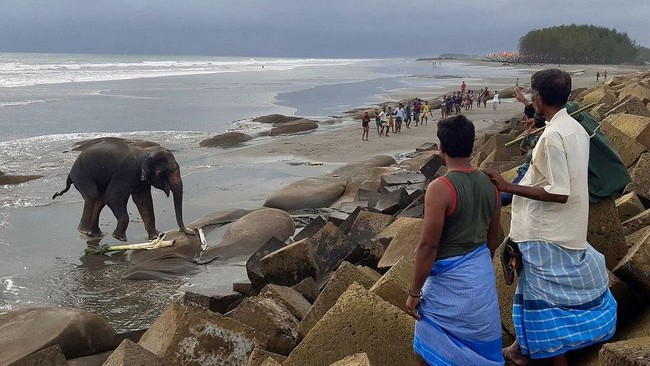 Dua ekor gajah berhasil diselamatkan ketika terjebak di laut lepas pantai Bangladesh. Keduanya dibawa ke darat setelah empat hari terkatung-katung di laut.
