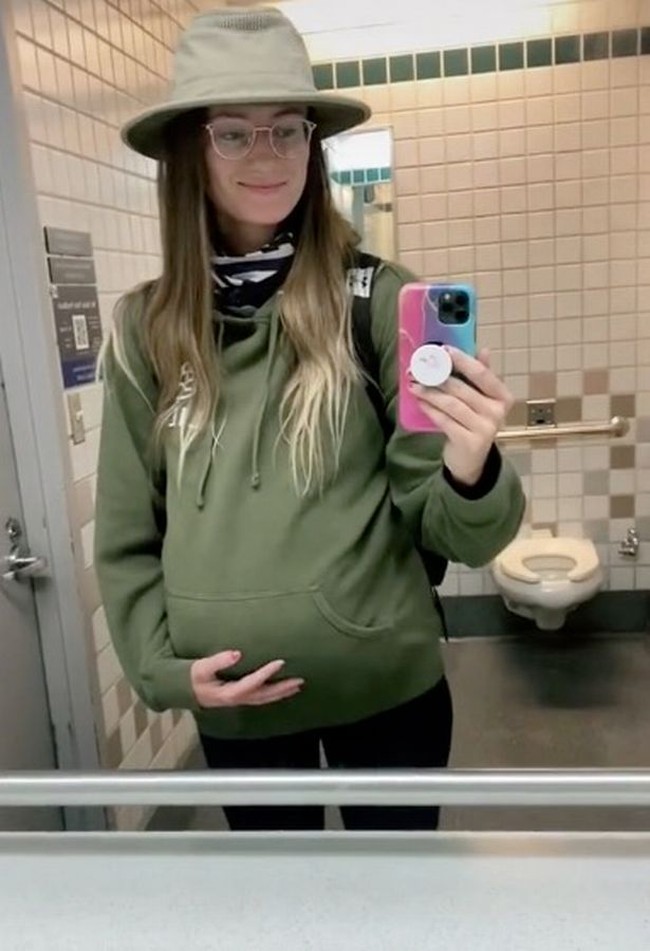 Setelah itu, barulah wanita ini memakai tas punggung. Seketika dirinya berubah jadi wanita hamil. Sambil terus memegang perut, wanita ini masuk dengan lengang ke dalam pesawat.