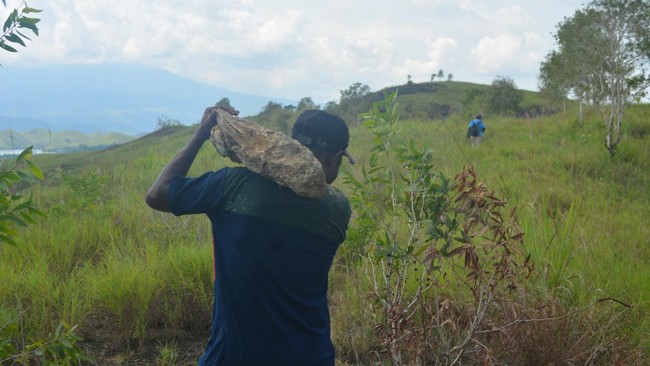 Setelah melewati puncak bukit, lokasi warga mengambil tanah liat bahan gerabah, kemudian tiba di lokasi ditemukannya fosil kayu.