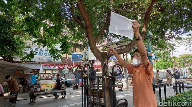 Pemasangan bendera putih di sepanjang Jalan Malioboro hanya bertahan satu jam. Bendera dipasang sebagai isyarat menyerah dari pelaku ekonomi di Malioboro menghadapi krisis COVID-19.