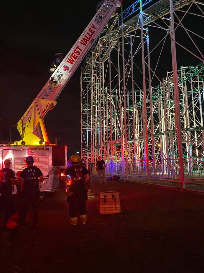 "Tadi malam pukul 20:38 unit WVFD dikirim untuk membantu Pemadam Kebakaran Sunland Park dengan penyelamatan teknis di Western Playland. Dua mobil di wahana roller coaster terjebak di atas wahana dengan 8 remaja. masih di tempat duduk mereka."