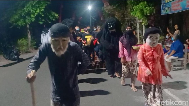 "Kesenian ini terdiri alat musik berupa gong serta kentongan bambu. Ada yang mengenakan kostum genderuwo sebagai jelmaan roh halus jahat penyebab pagebluk. Berjalan mengikuti pemeran kakek tua keliling kampung. Ini dipercaya mengusir pagebluk zaman dulu," kata Walgito.
