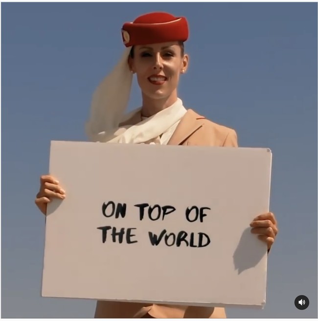 Pramugari itu mengenakan pakaian klasik awak kabin Emirates, komplet dengan topi dan kain yang menjuntai. Kain itu menunjukkan tiupan angin yang cukup besar. Si pramugari tersenyum relaks.