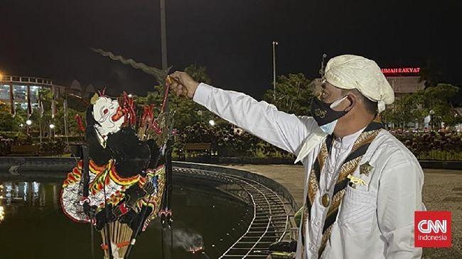 Dengan mengenakan jubah dan blangkon putih, Mbah Bejo mengawali ritualnya dengan memasang dua boneka wayang kulit tokoh Semar yang wajahnya berbeda warna, yakni putih dan hitam sebagai simbol suci dan angkara murka.