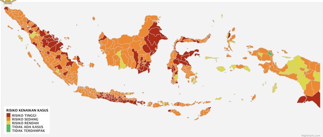 Kebanyakan daerah di zona merah mengalami penurunan risiko ke risiko sedang. Daerah yang masuk zona oranye atau risiko sedang kini mencapai 337 kabupaten kota. Untuk daerah risiko rendah mencapai 45 kabupaten/kota, sementara yang di zona hijau 1 kabupaten/kota saja.