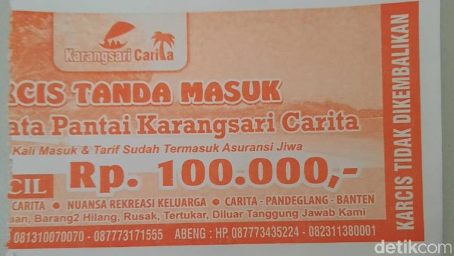 Hal serupa juga terjadi di Pantai Carita. Saat detikcom masuk ke area pantai, loket pembelian karcis tutup. Namun begitu parkir, tiba-tiba ada seorang ibu yang membawa karcis dan meminta kami untuk membayar tiket. Harganya sama, Rp 100 ribu per mobil.
