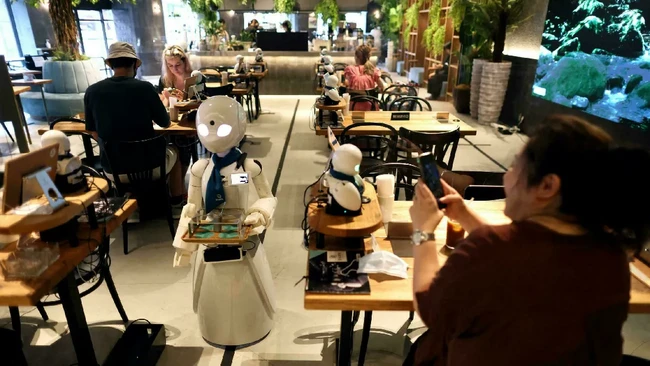 Saat pelanggan mengobrol dengan pelayan yang mengoperasikan robot mini, tiga robot yang lebih besar menyajikan minuman atau menyambut pelanggan di pintu masuk. Bahkan, ada robot barista dengan celemek cokelat di bar yang bisa membuat kopi dengan mesin press Prancis.