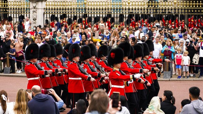 Parade pergantian penjaga Istana Buckingham kembali digelar. Upacara itu sempat disetop selama pandemi virus Corona.